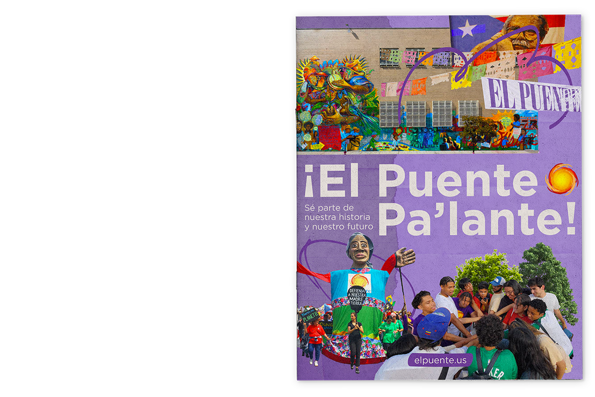Zine DesignEl Puente is a community human rights institution that promotes leadership for peace and justice through the engagement of youth and adult members of South Williamsburg’s Latine community in Los Sures. ¡El Puente Pa’lante!, an eight-page zine printed in English and Spanish, features a poster-size map of Los Sures, which is found by unfolding the zine and flipping it over, and a loose-leaf insert highlighting a current air quality campaign. This insert can be swapped out in the future to highlight their next campaigns, while maintaining the permanent historical and educational content in the zine itself.