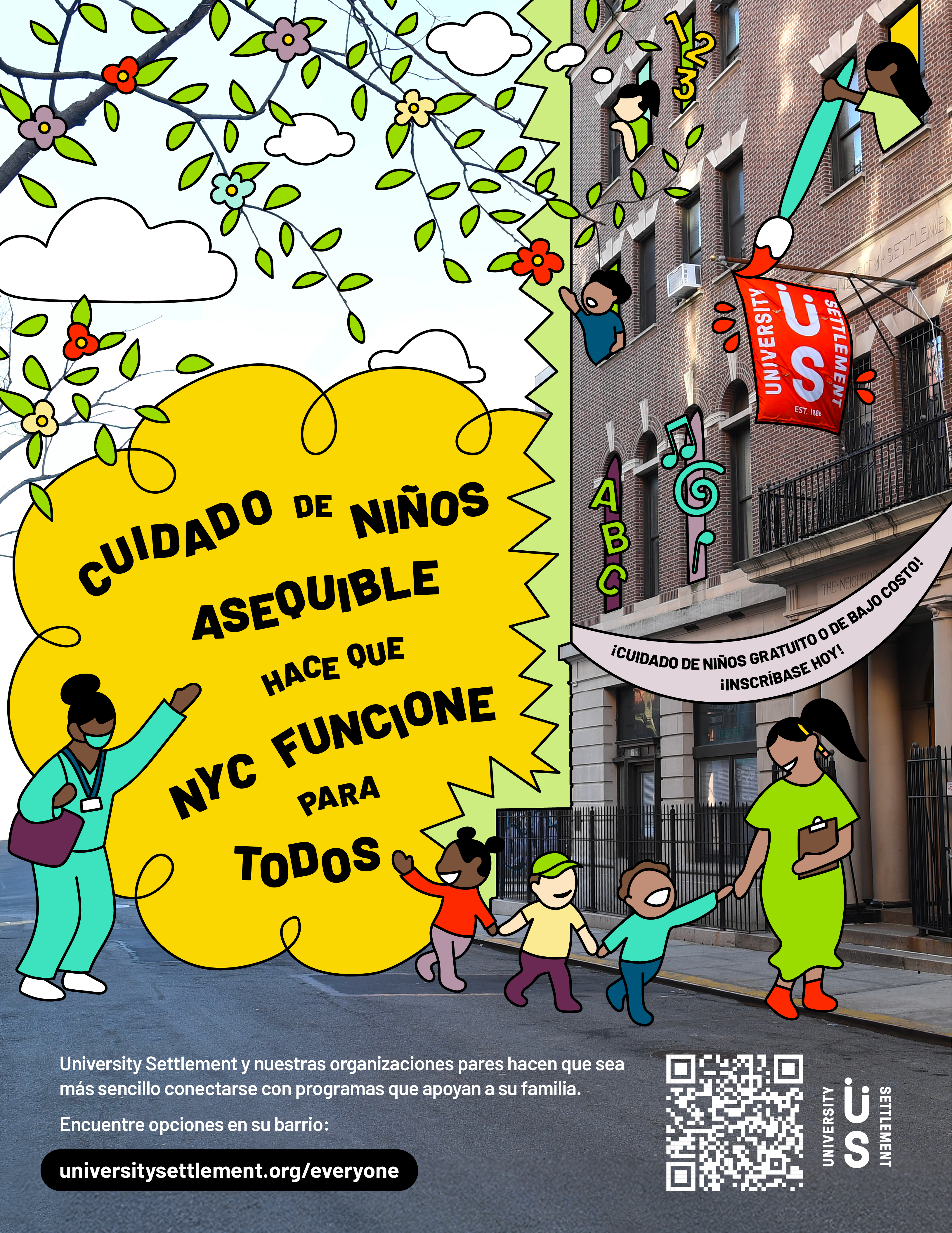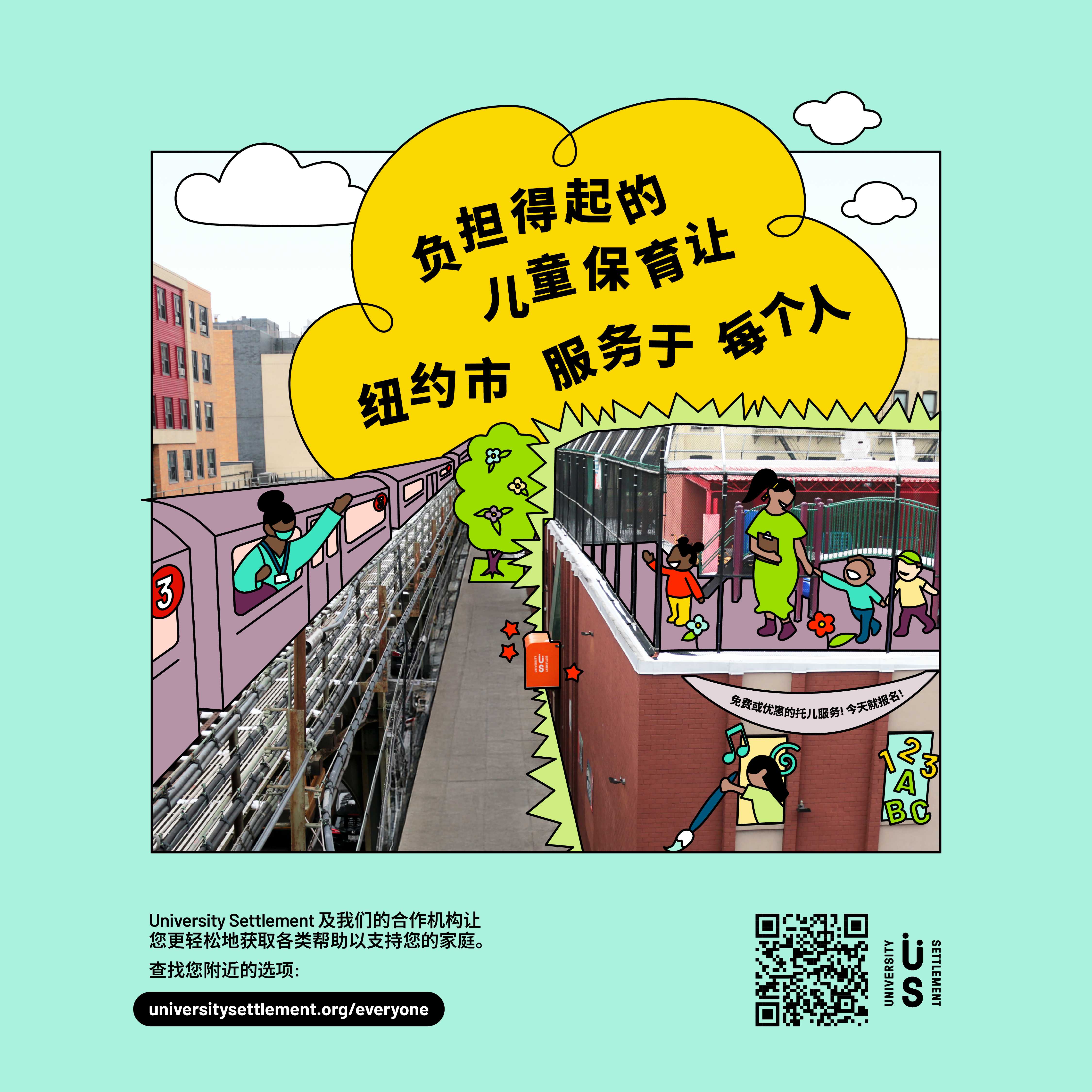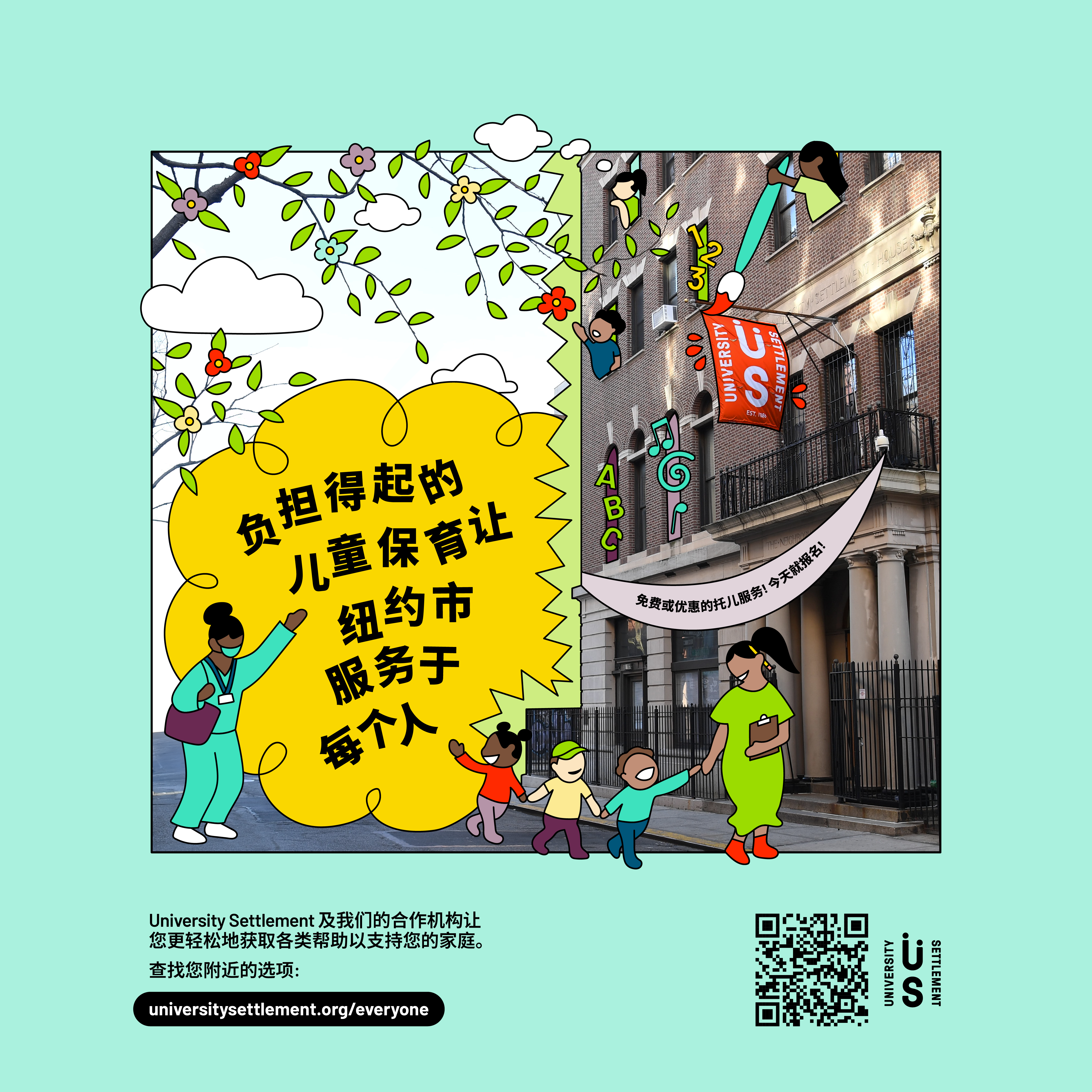 bureaucratic nightmare for working families, causing displacement out of the city. We created this multilingual print and digital campaign to show NYC parents that University Settlement and their peer organizations provide trusted community-based childcare options and resources.