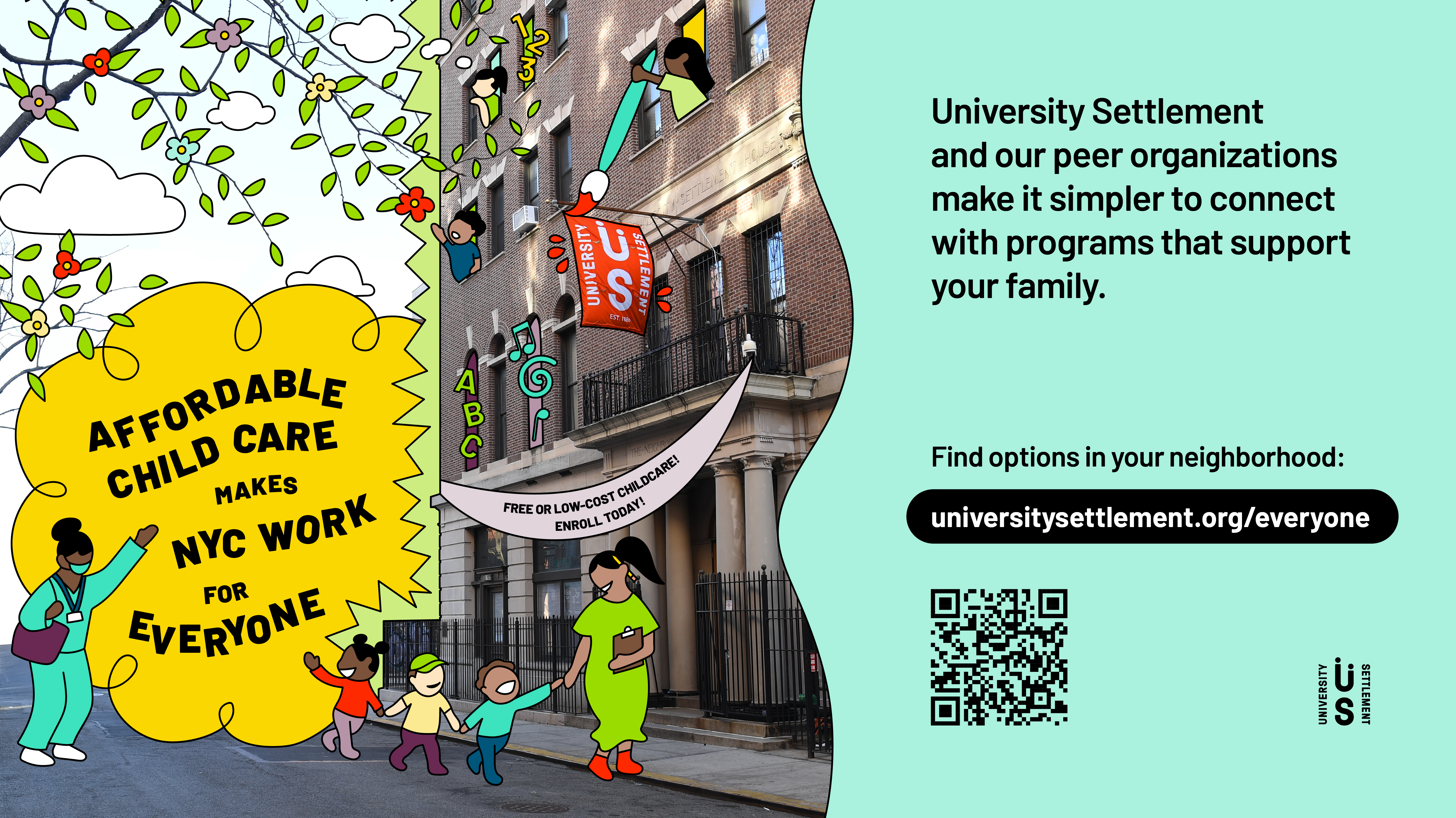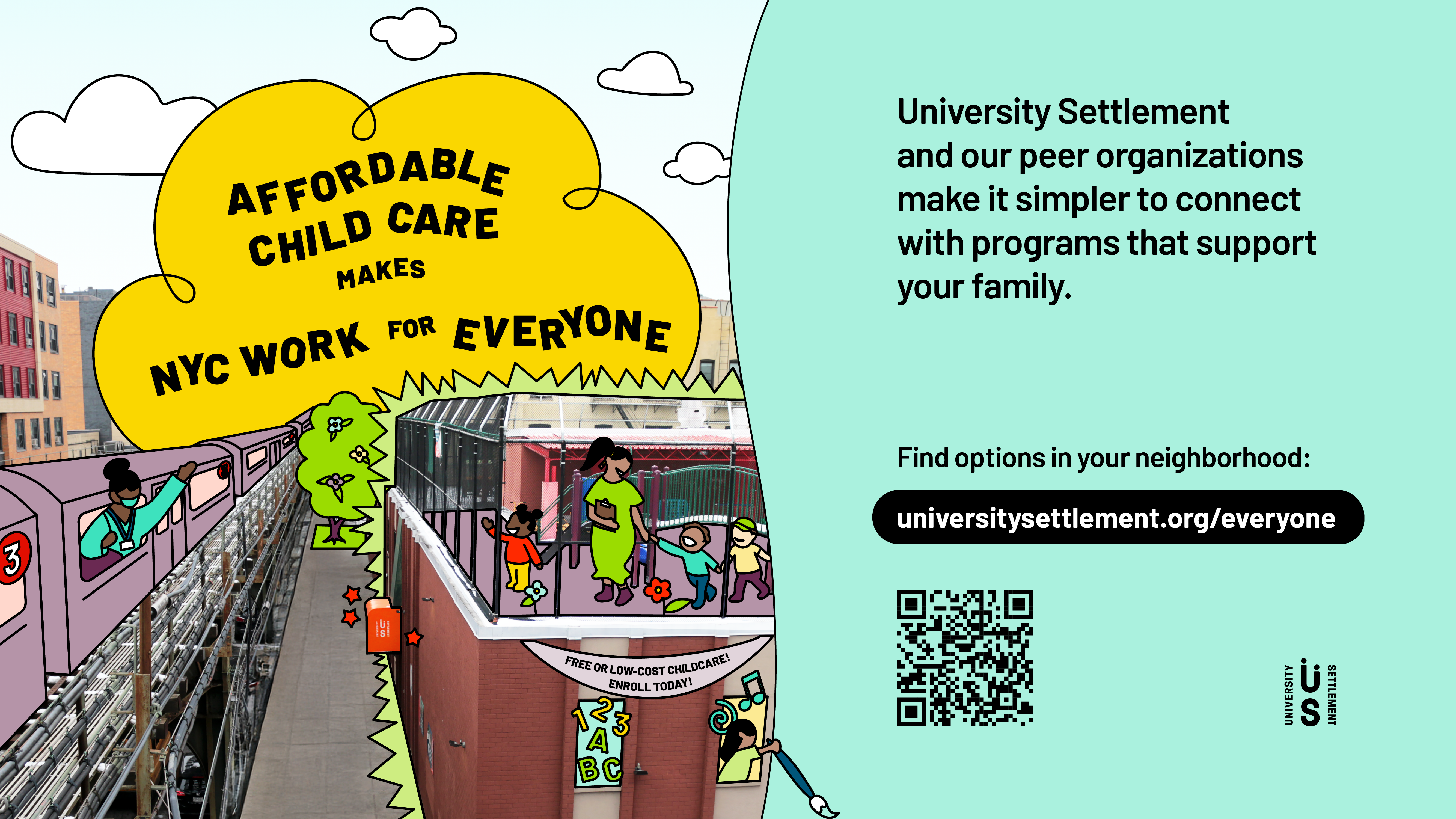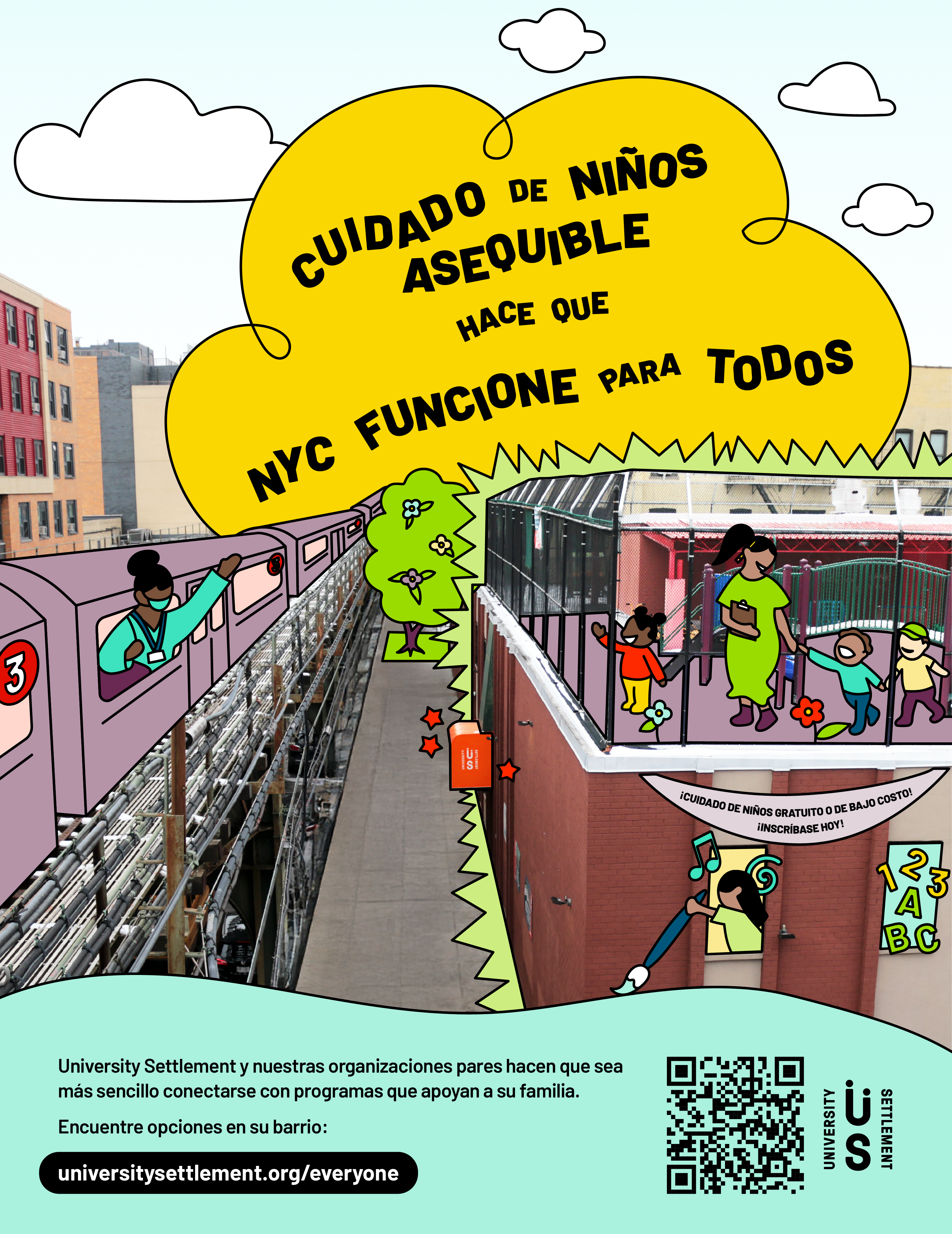 bureaucratic nightmare for working families, causing displacement out of the city. We created this multilingual print and digital campaign to show NYC parents that University Settlement and their peer organizations provide trusted community-based childcare options and resources.